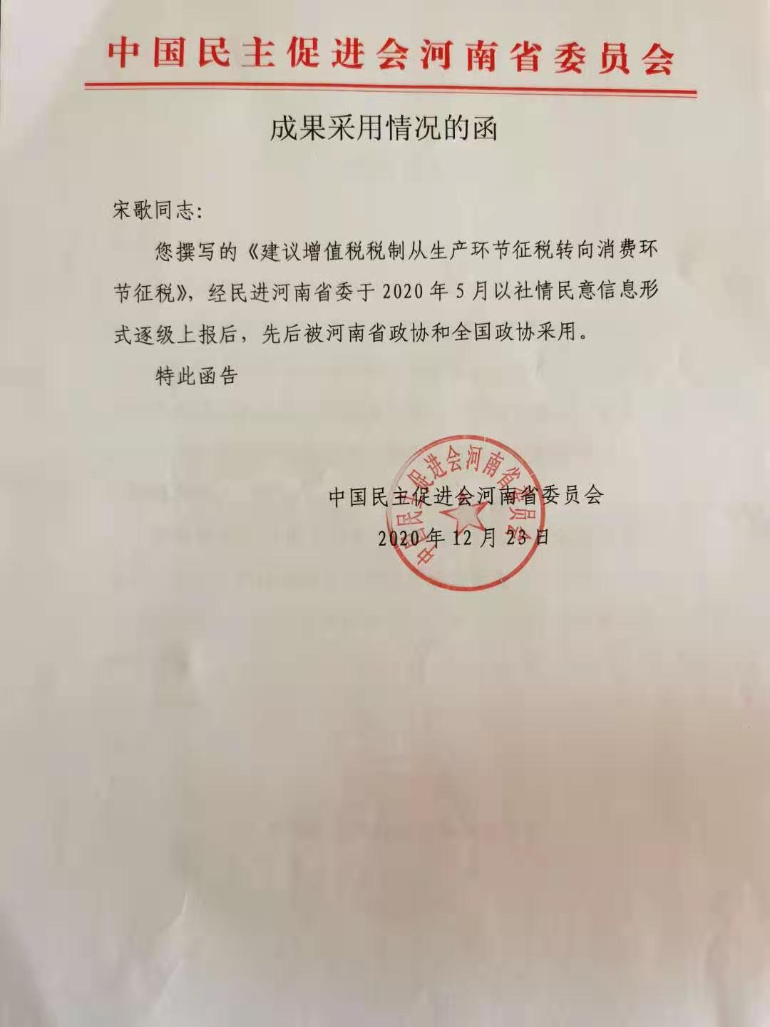 近日,从民进河南省委传来消息,beat365平台唯一官网民进会员宋歌老师撰写的《建议增值税制从生产环节征税转向消费环节征税》得到了全国政协和河南省政协共同采用。