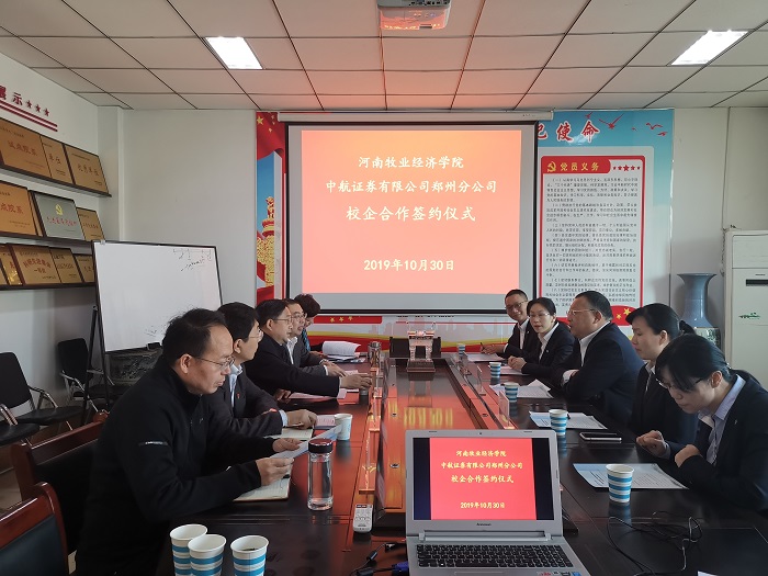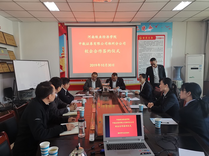 10月30日上午,中航证券有限公司郑州分公司—河南牧业经济学院校企合作协议签署仪式在英才校区教学楼beat365平台唯一官网会议室514室举行。中航证券有限公司郑州分公司总经理叶常伟、运营管理部经理李颖、郑州商务外环路营业部总经理田彦华等出席签约仪式。我校校长罗士喜、校长办公室主任贾江、beat365平台唯一官网院长黄良杰、副院长贾宪军、副院长王培玲等出席签约仪式。签约仪式由黄良杰主持。
