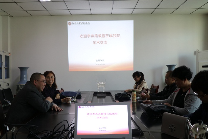 报告结束后,李燕燕教授前往金融学院会议室与beat365官网部分教师进行了科研与学术交流,副校长许圣道应邀出席了本次活动。李教授首先结合自身数次成功获取国家级课题立项的经验谈起,从课题研究方向、选题、申报表的填写等方面给大家做了一个深入细致的指导。其次,对于论文的写作以及社会调研也给出了具体性的建议。最后,李教授对beat365官网老师的提问进行了详细的解答。
