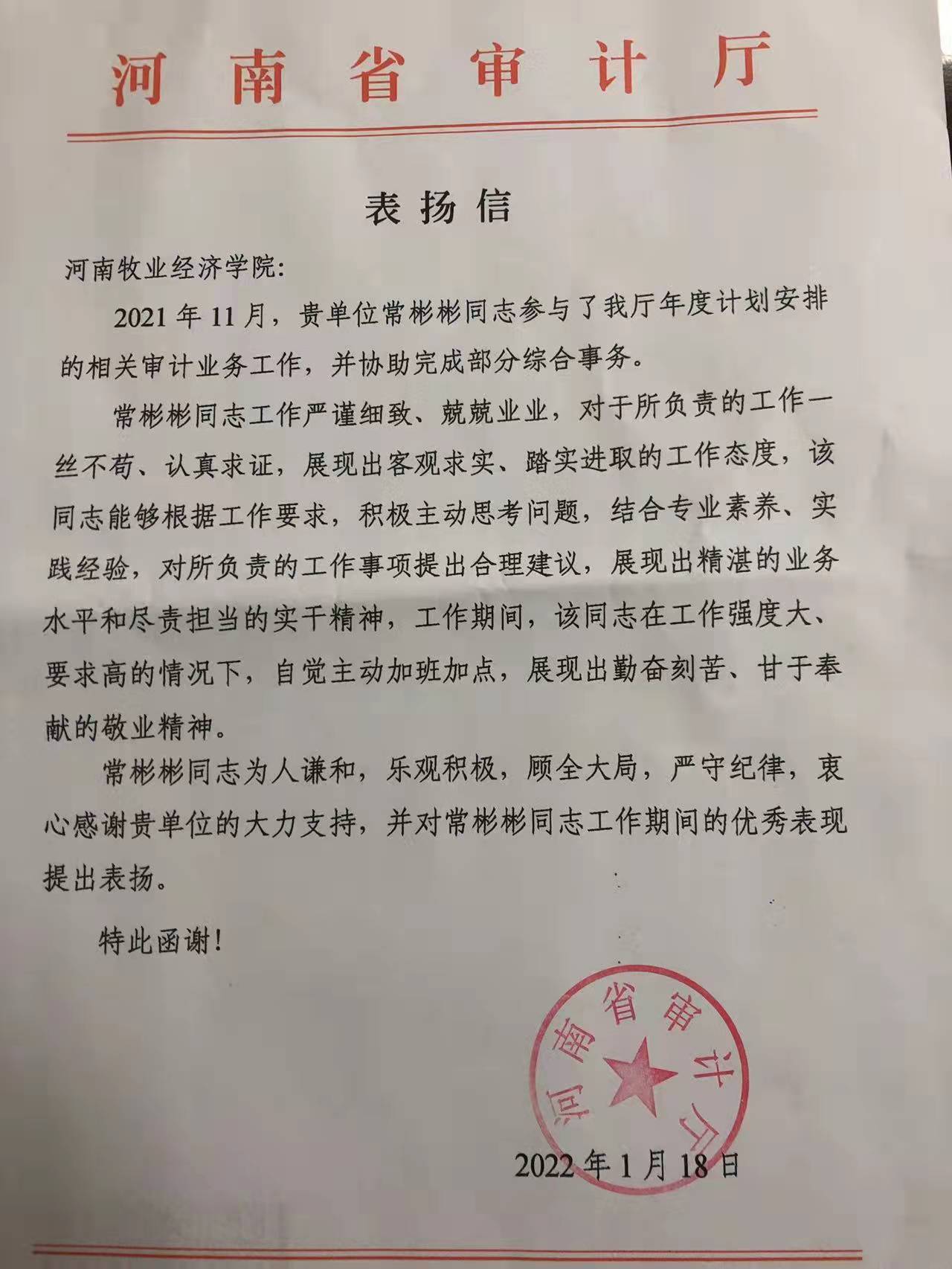 近日,beat365官网收到河南省审计厅发来的表扬信,信中对beat365官网借调审计厅的常彬彬老师在年度相关审计业务工作中做出的贡献给予了充分的肯定。
