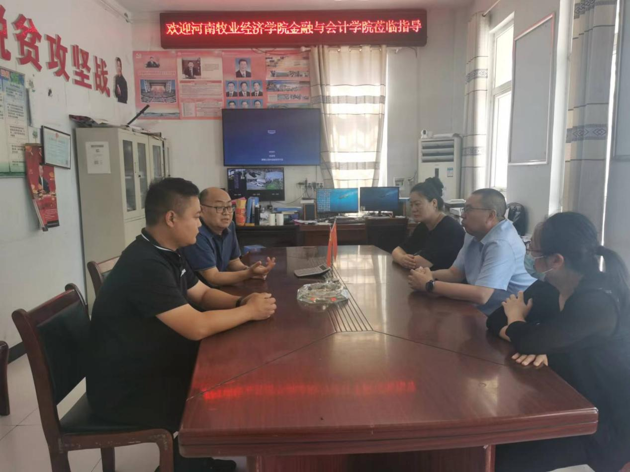 最后,在大马庄村委会,黄良杰教授一行与学校驻村第一书记刘建伟就大马庄乡村振兴问题进行了交流,刘建伟书记指出大马庄近年来在基础设施、公共服务、产业发展、共同富裕等方面发生了翻天覆地的变化,打赢了脱贫攻坚战,有效衔接了国家的乡村振兴战略。黄院长指出利用资本市场支持企业发展壮大进而带动新蔡县产业发展是巩固脱贫成果、避免脱贫户返贫、实现乡村振兴的重要途径之一。