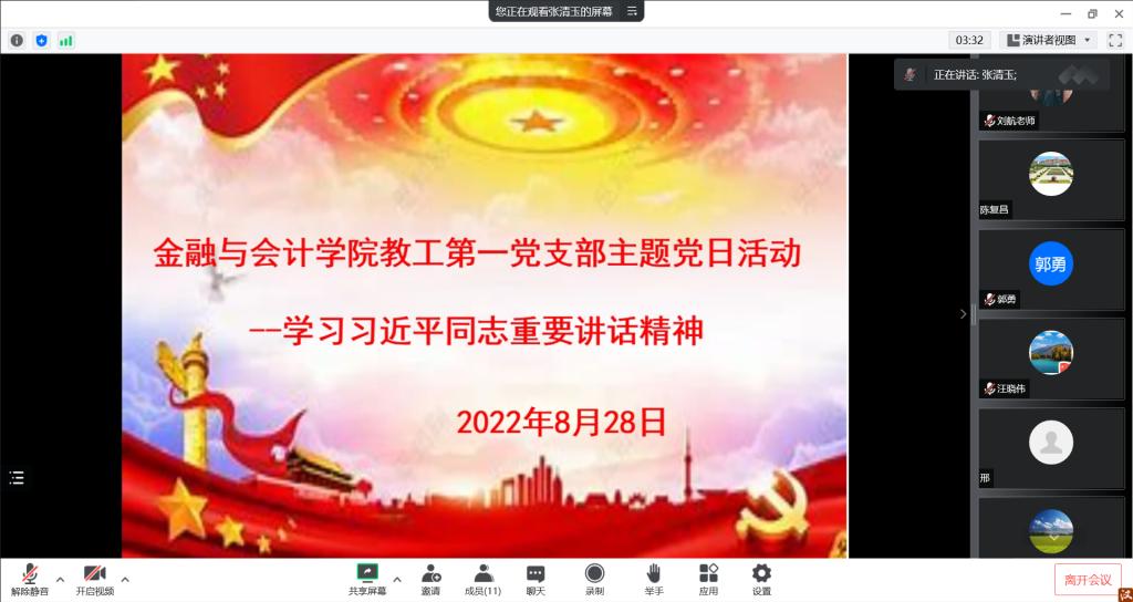 2022年8月28日,beat365平台唯一官网教工第一党支部举行主题党日活动,采用线上会议形式举行。本次主题党日活动的主题是围绕学校7、8月份主题党日活动安排进行理论学习与研讨,并学习习近平总书记给“中国好人”李培生、胡晓春回信精神,会议由支部书记张清玉同志主持。
