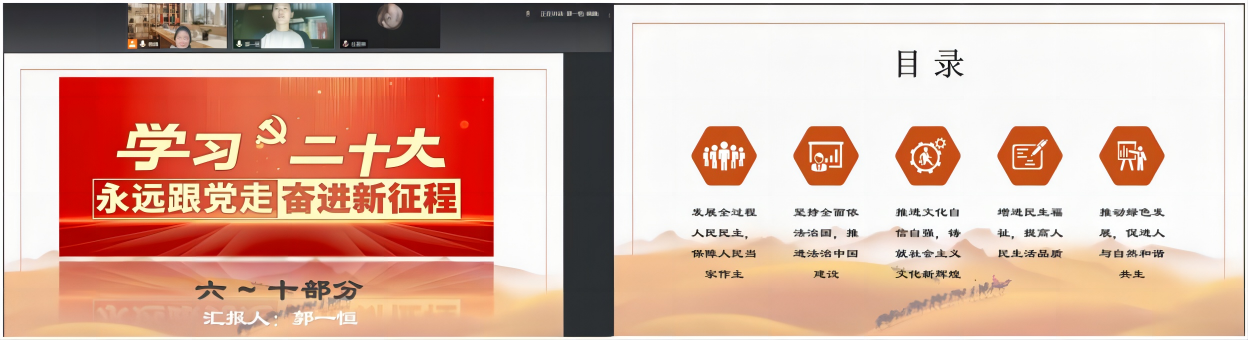 支部组织委员李敏敏主要领学了“过去五年的工作和新时代十年的伟大变革”、“开辟马克思主义中国化时代化新境界”“新时代新征程中国共产党的使命任务”、“加快构建新发展格局,着力推动高质量发展”“实施科教兴国战略,强化现代化建设人才支撑”等主题的报告内容,并结合业务展开了思想交流,提出党的二十大报告振奋人心,应在思想上、行动上与党的二十大精神保持高度一致,解放思想、真抓实干,把学习成果转化为工作实际成效。在今后教学工作中将会以更加饱满的热情,务实的作风,坚定信念、立足岗位,培养出更多优秀的人才。支部宣传委员郭一恒领学了“发展全过程人民民主,保障人民当家作主”、“坚持全面依法治国,推进法治中国建设”“推进文化自信自强,铸就社会主义文化新辉煌”、“增进民生福祉,提高人民生活品质”、“推动绿色发展,推进人和自然和谐共生”等主题内容,并提出作为一名中共党员,应肩负历史使命,有吃苦耐劳精神和责任感,增强信心斗志,保持战略清醒,为全面建设社会主义现代化国家作出贡献。