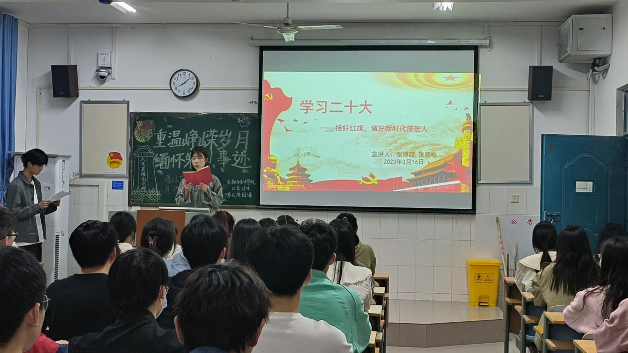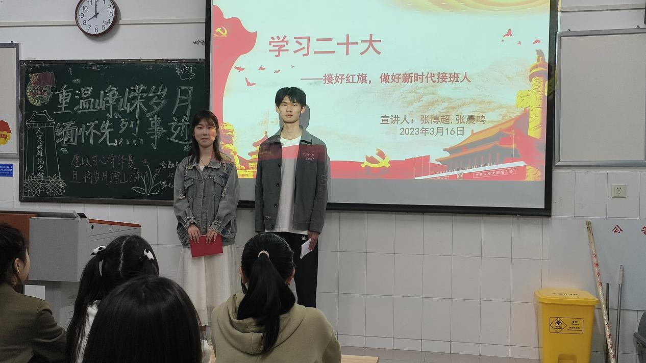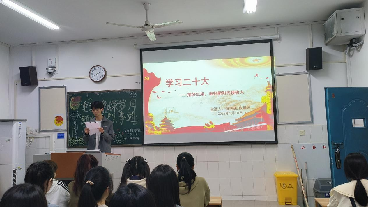 学习党的二十大精神,对于当代青年强化思想引领、增强政治认同、培养爱国主义情怀,具有重要意义。beat365平台唯一官网学习党的二十大精神宣讲团于3月30日晚走进22会计01班,开展了雷锋月最后一次以“学习党的二十大,争做新时代青年”为主题的宣讲活动。本次主讲人为22会计01张博超同学和22会计01张晨鸣同学。