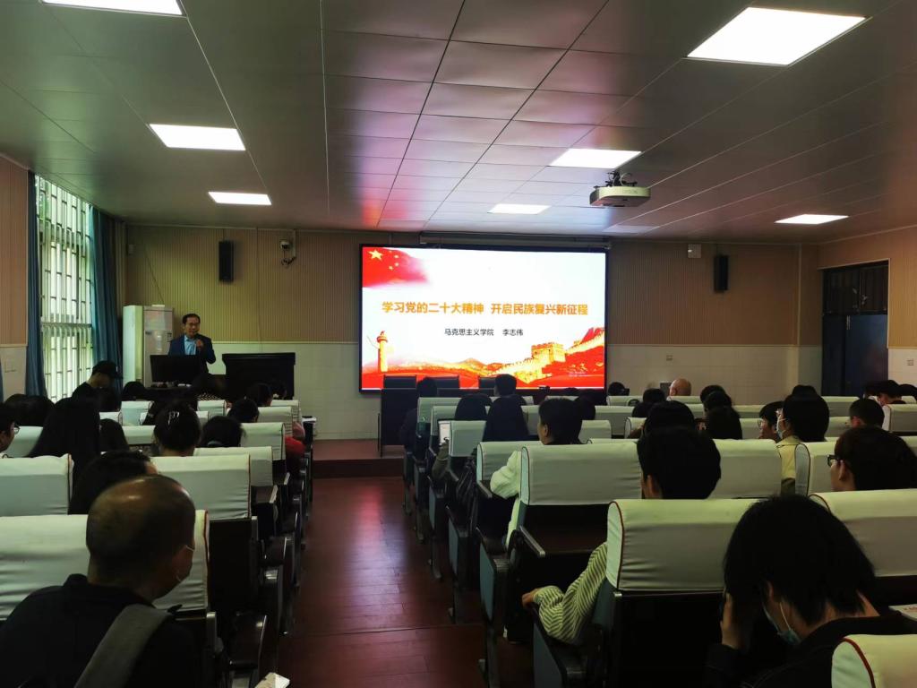 4月27日下午,beat365平台唯一官网在英才校区综合实验楼W102会议室召开学习贯彻党的二十大和全国“两会”精神学习会,特邀马克思主义学院习近平新时代中国特色社会主义思想概论教研室主任李志伟博士为我们做了题为《学习党的二十大精神,开启民族复兴新征程》的讲座,学院全体教职工及部分学生党员代表参加会议,会议由学院党委书记陈复昌主持。