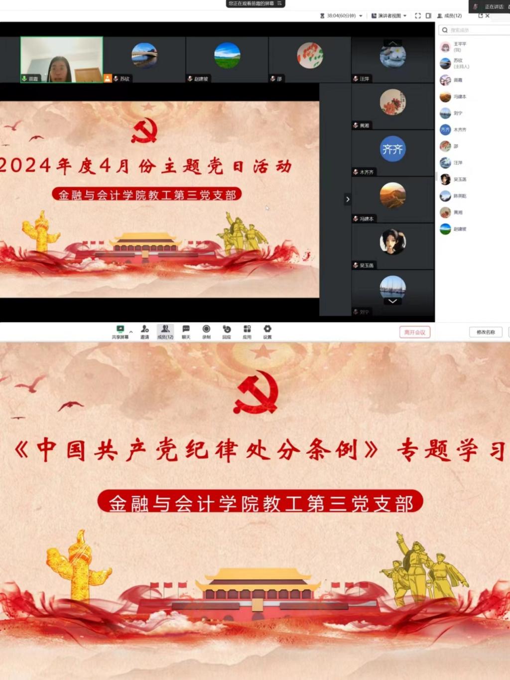 2024年4月30日下午,beat365平台唯一官网教工第三党支部以线上腾讯会议的形式开展了4月份主题党日活动暨新修订《中国共产党纪律处分条例》专题学习,支部全体党员参加,会议由支部书记苗霞主持。