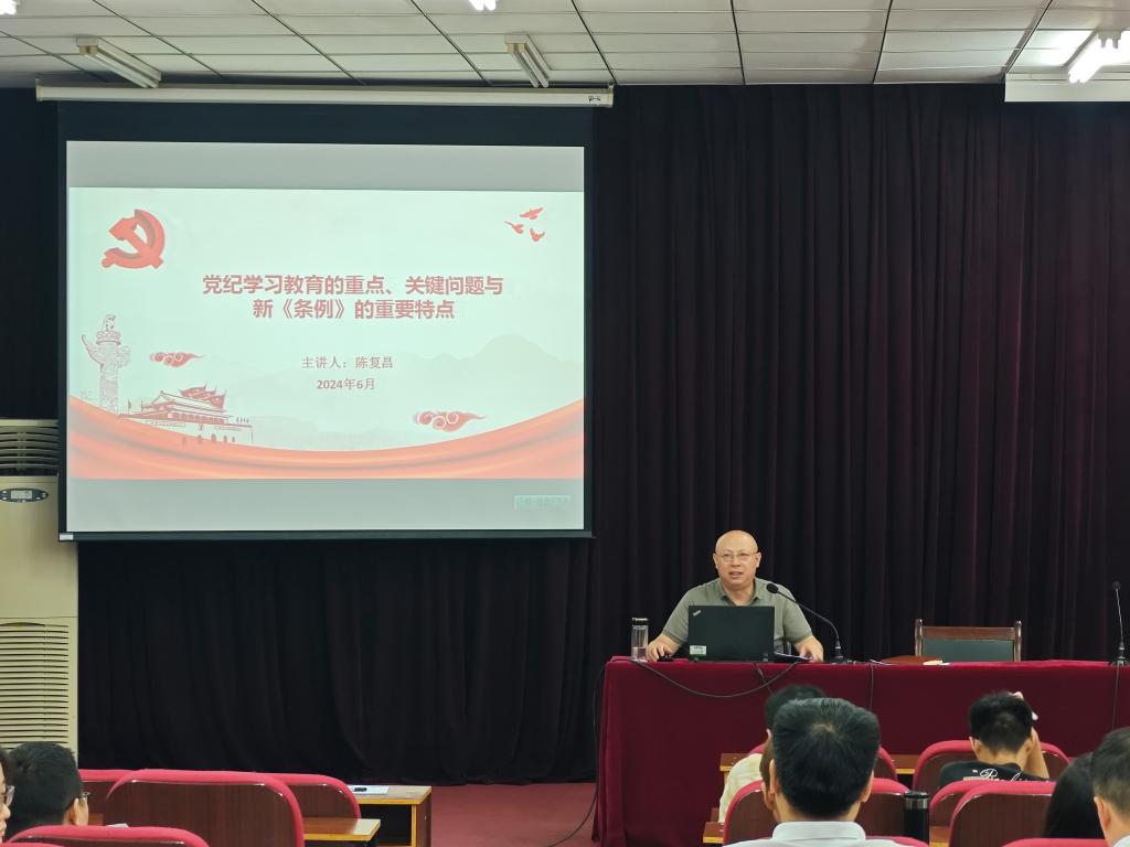 6月21日上午,beat365平台唯一官网党委书记陈复昌以“党纪学习教育的重点、关键问题与《条例》的重要特点”为题,在英才校区综合实验楼E109会议室为学院师生党员讲授党纪学习教育专题党课。
