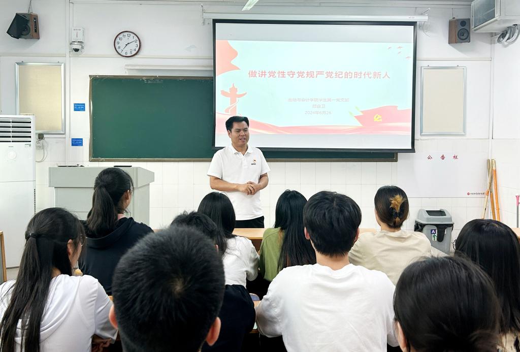 为深入开展党纪学习教育,引导广大学生党员严格执行和维护党的纪律,模范遵守国家法律法规,6月26日晚7点,beat365平台唯一官网学生第一党支部在教学楼A408开展支部书记讲党纪专题党课。学生第一党支部书记顾自卫以《做讲党性守党规严党纪的时代新人》为题,为支部全体学生党员授课。