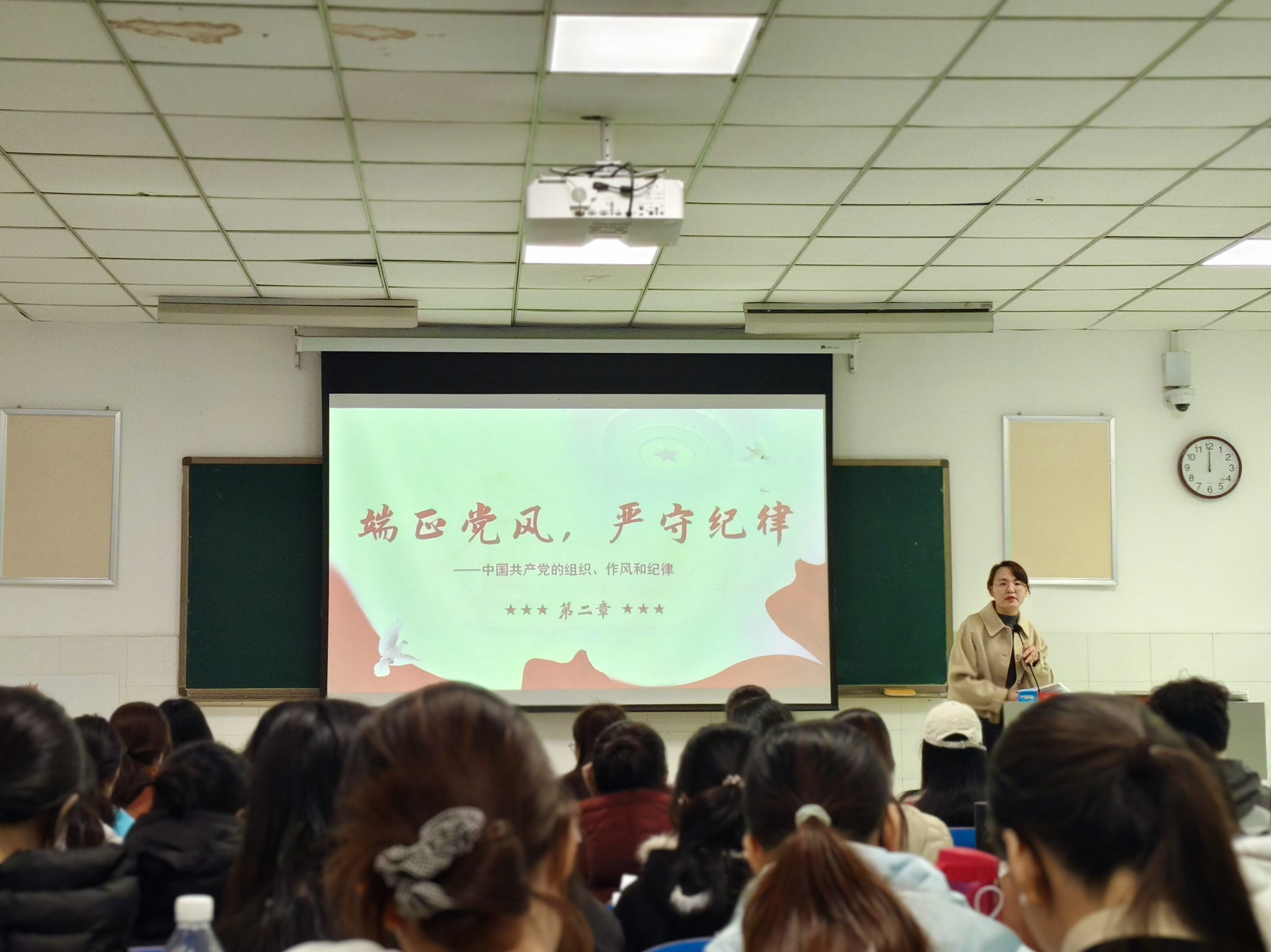李老师以中国共产党百年奋斗历程为切入点,首先,阐述了党在不同历史时期能够不断从胜利走向胜利的重要原因——严密的组织体系、严明的纪律要求和优良的作风传统。她指出,作风和纪律是党的生命线,是保持党的先进性和纯洁性的根本保证。每一位入党积极分子都应深刻理解“端正作风、严守纪律”的内在要求,在思想上、行动上自觉与党组织保持高度一致。其次,围绕“党的组织原则”“党的作风建设”“党的纪律要求”三个方面展开讲解。系统阐释了民主集中制的科学内涵,强调民主是集中的基础,集中是民主的保障,二者相辅相成、不可分割。作为入党积极分子要从日常学习与生活做起,求真务实、勇于担当,以优良作风展现新时代青年的精神风貌。最后,在纪律教育部分,李老师结合典型案例,讲解了党的政治纪律、组织纪律、廉洁纪律、群众纪律、工作纪律和生活纪律的主要内容及特点。李老师寄语全体学员,希望大家以此次培训为新的起点,进一步端正入党动机,坚定理想信念,不断提高党性修养,严格党内纪律作风,在学习、工作和生活中严格要求自己,以实际行动向党组织靠拢,争取早日成为一名合格的共产党员。