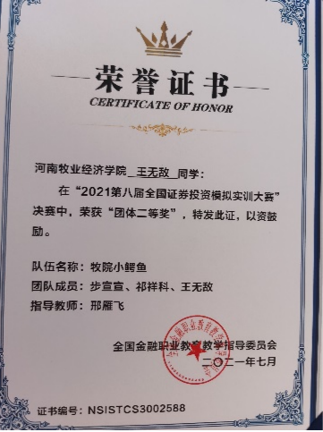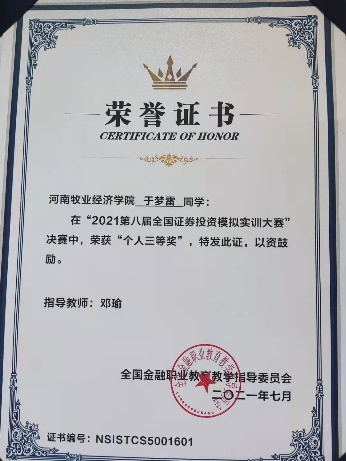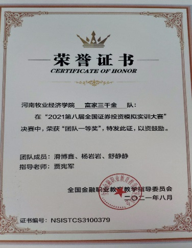 本次大赛共有来自全国589所院校,21046支队伍,65673人参赛。比赛历时3个月,从报名阶段开始院领导就高度重视,副院长贾宪军带队,选拔出186名学生及9名教师,组成52个团队参赛。3个月以来,历经了学生动员培训会、教师多次精心指导、学生不断优化策略、突围区域选拔赛、挺进决赛,最终把握大势、精准交易、强化风险,获得了一个团体一等奖、四个团体二等奖、六个团体三等奖,以及五个个人一等奖和二等奖,创beat365官网参赛以来的最好成绩。