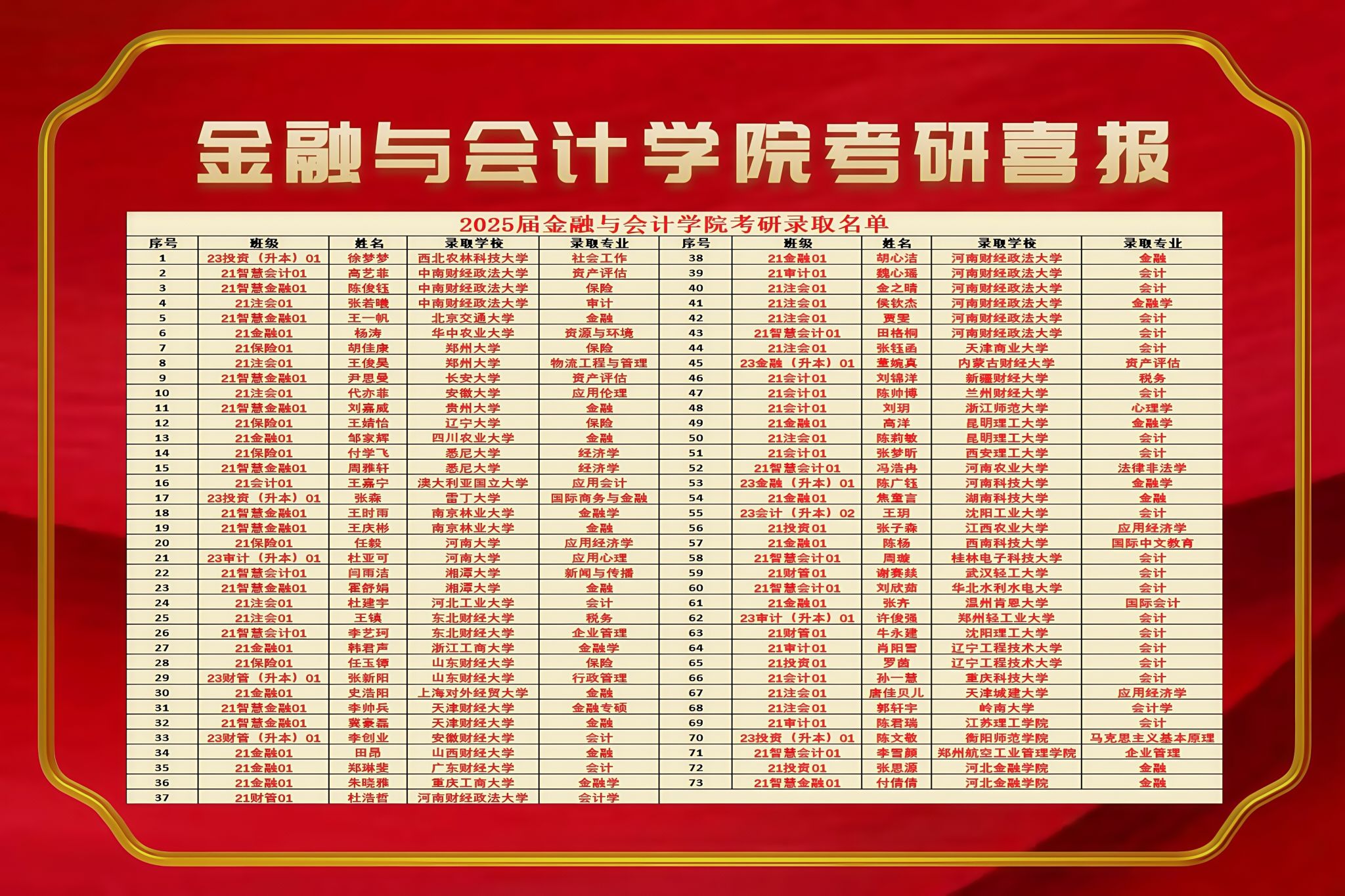 从录取专业来看,会计学、金融学仍为报考热门,录取人数占比超60%。其中,金融学专业毕业生111人,考研录取25人,录取率22.5%,再创新高;从录取学校来看,国内知名财经类大学显著增多,录取专业覆盖金融学、会计学、审计学、税务和资产评估等领域,学科专业对口录取率显著提升,充分展现了学院“厚基础、宽口径、强能力”的人才培养成效。