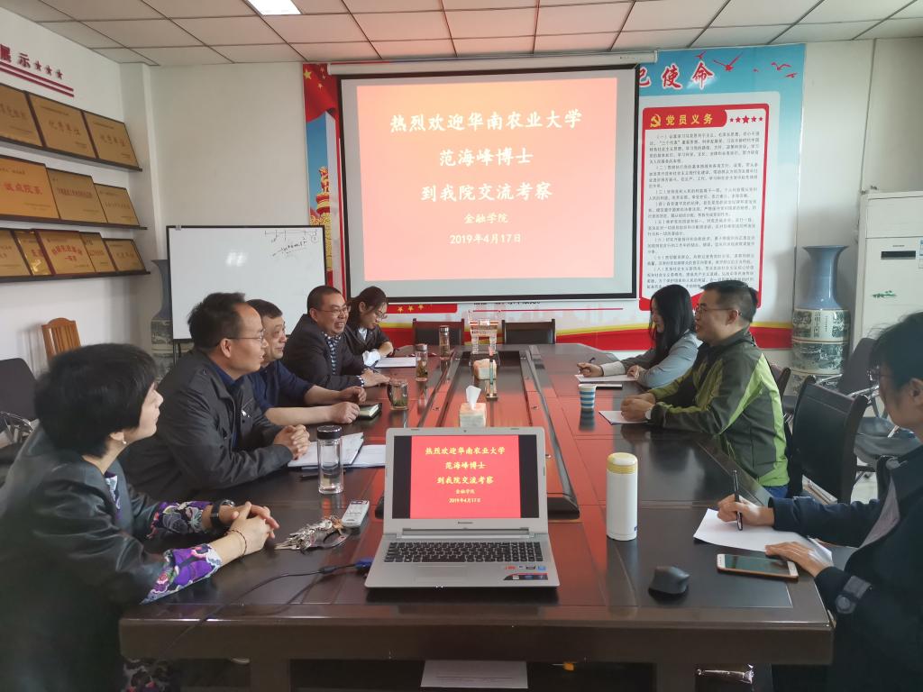 2019年4月17日,应金融学院的邀请,华南农业大学副教授、硕士生导师范海峰博士在英才校区办公楼514会议室就学科专业建设、教研科研方面和beat365官网部分教师进行了交流,金融学院班子成员参加了座谈会。