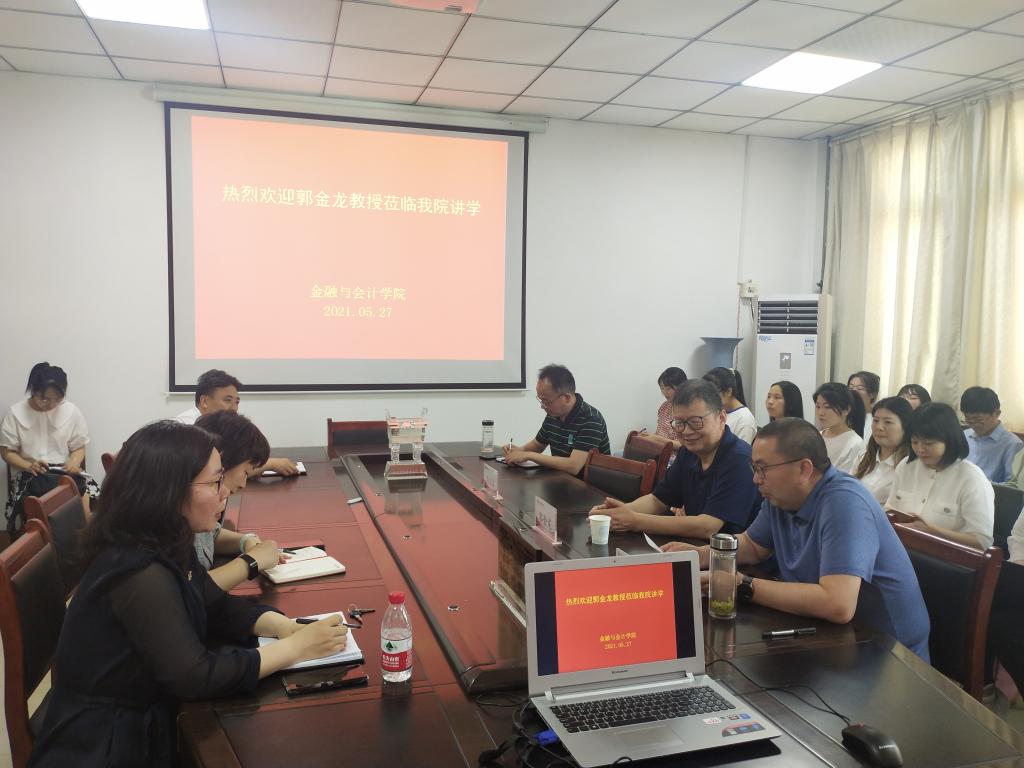 5月27日下午,beat365平台唯一官网特邀中国社会科学院教授、博士生导师郭金龙,在英才校区教学楼514会议室为师生作了题为《金融机制与家庭财富管理》的学术讲座。beat365官网教师和学生代表在场聆听,本次活动由beat365平台唯一官网院长黄良杰主持。