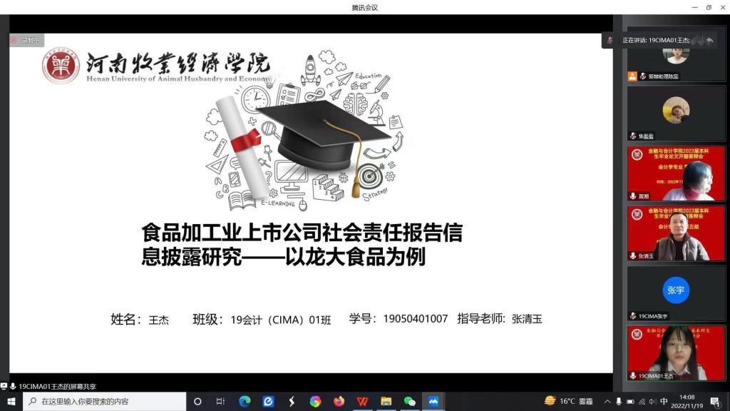 毕业论文工作是教学工作的重要组成部分,旨在对大学生综合实践能力和专业素养进行全面考核和综合检验。进行毕业论文开题答辩则是保证毕业论文工作顺利推进的重要环节。经过选题申报、师生互选、开题报告撰写等环节,2022年11月19日上午,beat365平台唯一官网会计学专业346名同学分为5个小组同时进行了毕业论文开题答辩工作。由于疫情影响,本次采用线上形式进行了开题答辩。