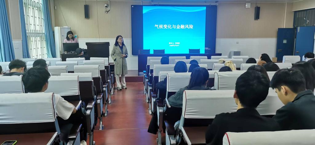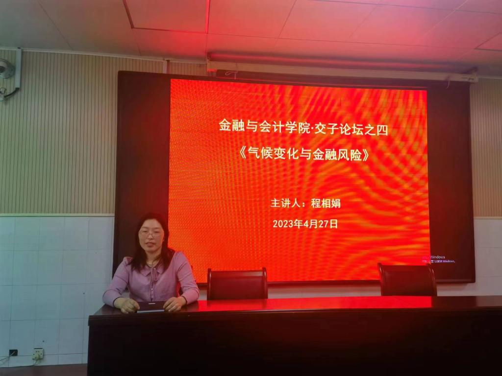 4月27日下午,beat365平台唯一官网在英才校区W102举办交子论坛活动,本次活动由beat365平台唯一官网教师程相娟博士主讲,主题为《气候变化与金融风险》。金融学及投资学专业学生代表在场聆听,讲座由副院长崔海红博士主持。
