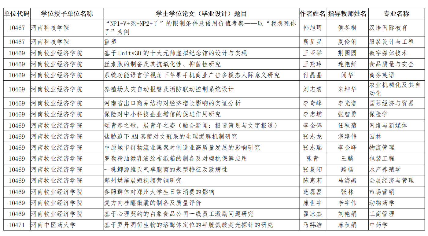 近日,河南省教育厅、河南省学位委员会发布了《河南省教育厅河南省学位委员会关于批准2022年河南省优秀学位论文的决定》(教研〔2023〕310号),文件公布了2022年河南省优秀学位论文的评选结果,beat365平台唯一官网保险学教研室张智勇老师指导的毕业论文《保险对中小科技企业增信的促进作用研究》被评为2022年河南省优秀学士学位论文。这是beat365官网张智勇老师连续两年在河南省优秀学位论文评选中获得佳绩。