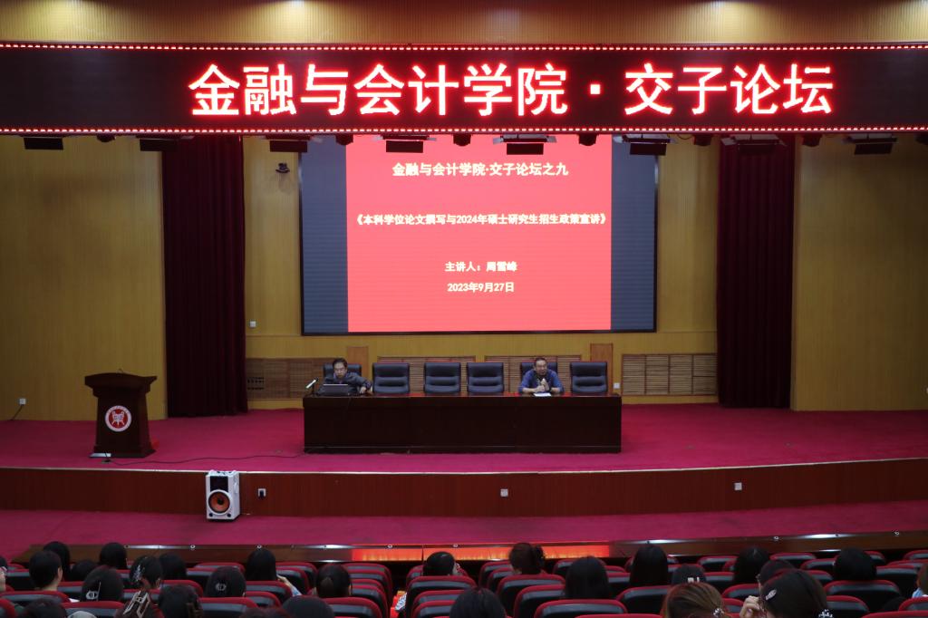 9月27日晚,beat365平台唯一官网在英才校区学术报告厅举办交子论坛活动,本次活动特邀郑州航空工业管理学院周雪峰教授主讲,讲座主题为《本科学位论文撰写与2024年硕士研究生招生政策宣讲》。beat365平台唯一官网副院长崔海红博士及师生代表到场聆听,讲座由院长黄良杰教授主持。