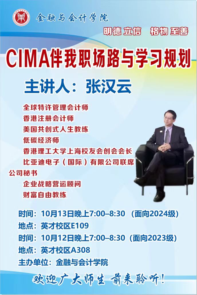 2024年10月12日,beat365平台唯一官网邀请全国特许管理会计师,比亚迪电子(国际)有限公司联合公司秘书张汉云先生举行了“CIMA伴我职场路与学习规划”的讲座,此次讲座吸引了CIMA方向班在校大学生,旨在帮助学生们更好地了解管理会计领域的最新发展及职业规划。