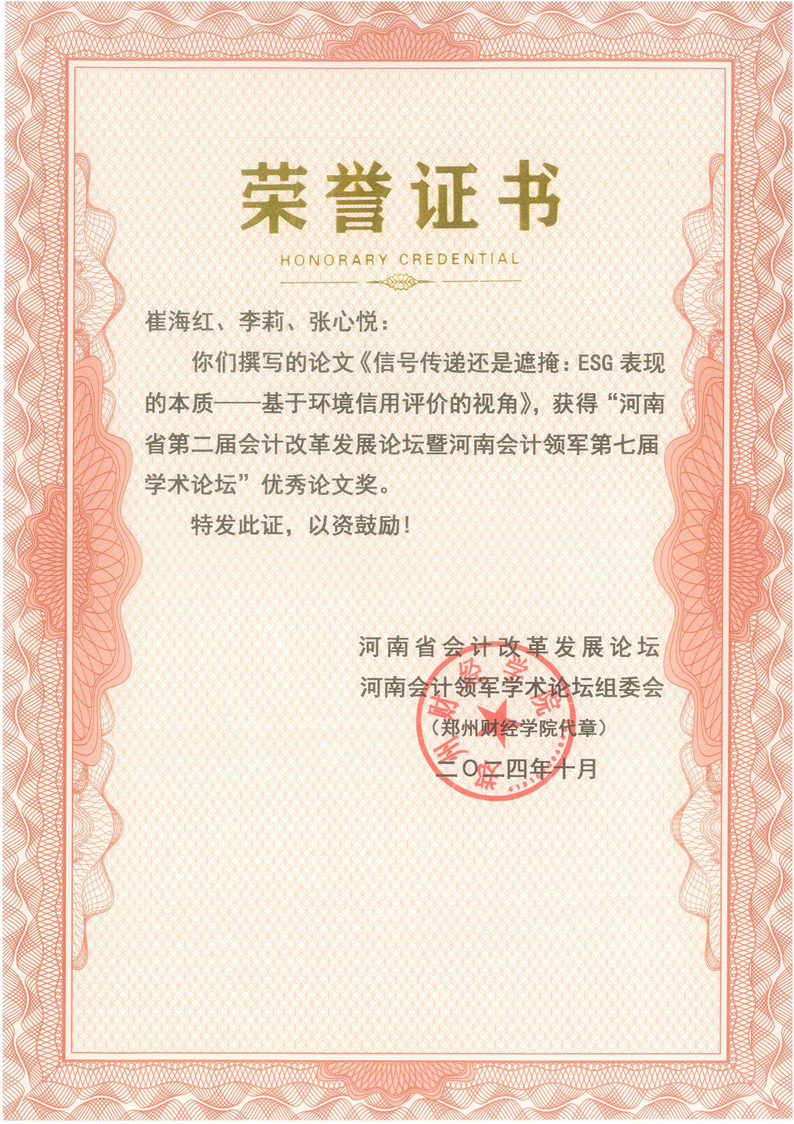 优秀论文颁奖环节,beat365官网崔海红与张心悦、李莉合作撰写的《信号传递还是遮掩:ESG表现的本质-基于环境信用评价的视角》论文被评为河南会计第七届学术论坛优秀论文。