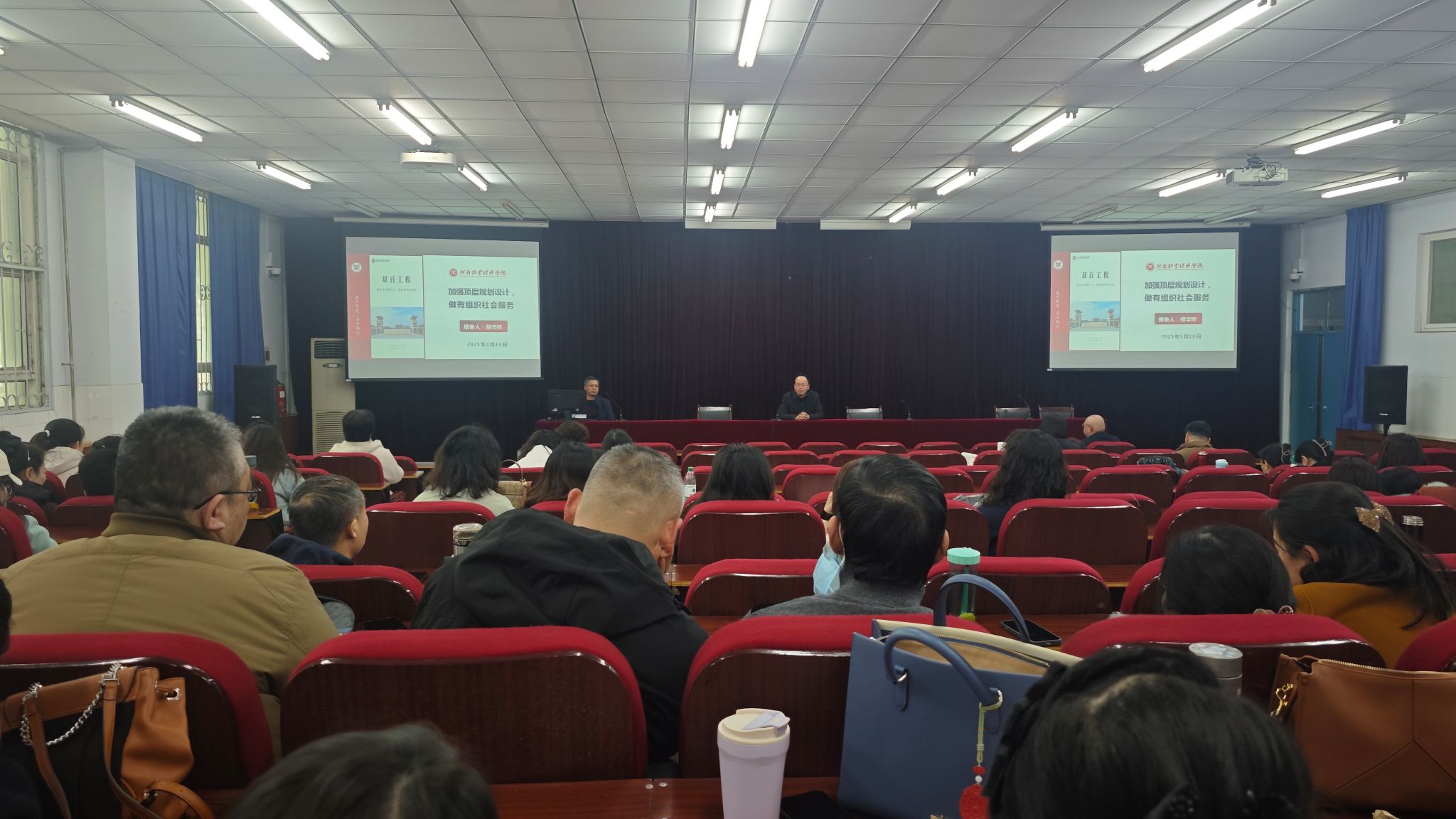 在报告中,胡华锋主任强调了顶层设计的重要性,提出要通过系统规划和资源整合,推动社会服务工作与人才培养、科学研究深度融合。他结合实际案例,分享了如何通过社会服务工作提升学院的社会影响力和办学水平。