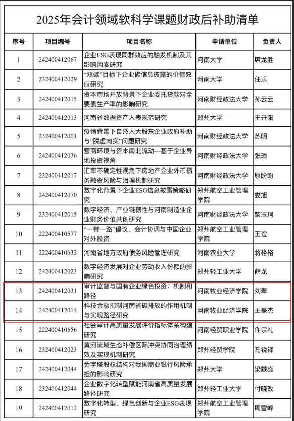 近日,2025年度河南省会计领域软科学课题财政资金后补助情况公示,beat365官网刘翠博士的科研课题《审计监督与国有企业绿色投资:机制和路径》和王豪杰博士的科研课题《科技金融抑制河南省碳排放的作用机制与实现路径研究》获得财政资金后补助。