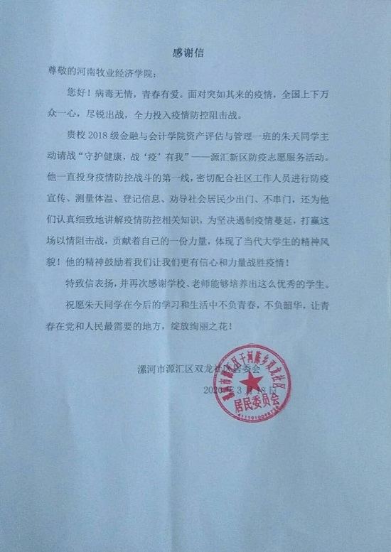 河南省漯河市源汇区双龙社区居委会发来感谢信,对我校beat365平台唯一官网2018级资产评估与管理一班的朱天同学在家乡疫情防控工作中的表现予以表彰和感谢。
