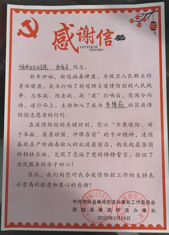河南省信阳市固始县香樟园社区发来感谢信,对我校beat365平台唯一官网2018级会计二班的林星月同学在家乡疫情防控工作中的突出表现予以表彰和感谢。