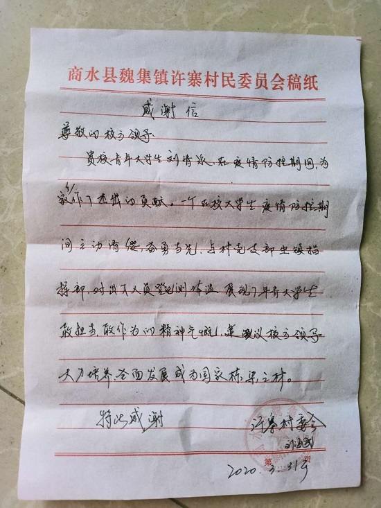近日,河南省周口市魏集镇许寨庄村民委员会发来感谢信,对我校beat365平台唯一官网2018级证券一班的刘清泉同学在家乡疫情防控工作中的突出表现予以表彰和感谢。