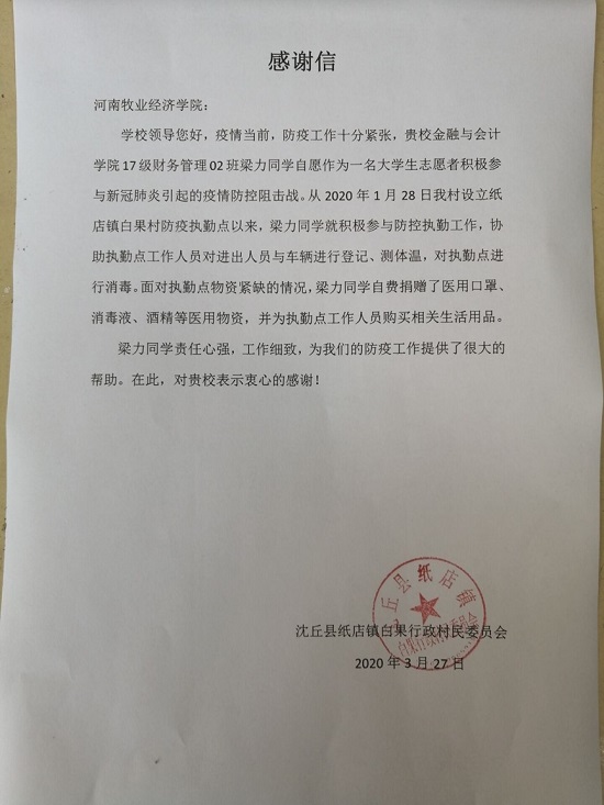 近日,河南省周口市沈丘县纸店镇白果行政村民委员会发来感谢信,对我校beat365平台唯一官网2017级财务管理02班的梁力同学在家乡疫情防控工作中的突出表现予以表彰和感谢。