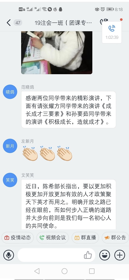 团课开展中,各个团支部围绕科学教育主题进行了广泛的讨论。有的团支部提出在当前新冠肺炎疫情影响下,应当引起同学们对成长成才的思考,不仅要有赤诚的爱国心,更要有爱国的能力。有的团支部通过直播方式,用身边的实例和近现代教育家的励志名言使同学们充分感受到了教育的意义。在各团员代表发言过程中,同学们积极参与、建言献策,为本次团课增添了一份活力。