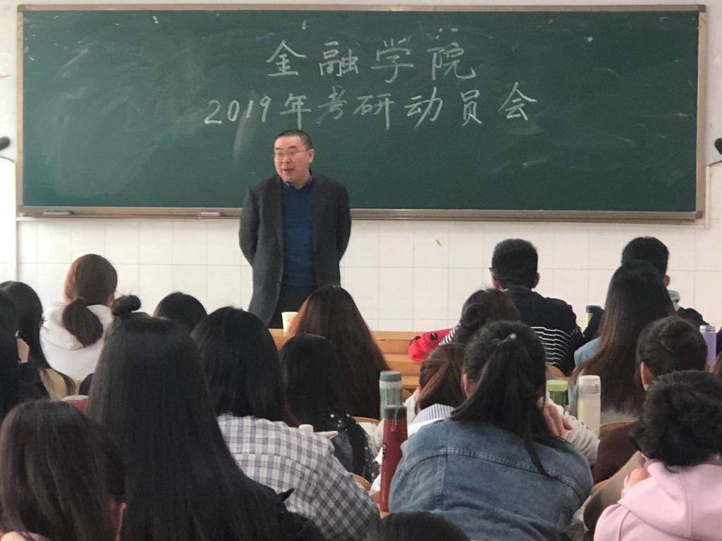 为了使同学们对考研有更加深入的了解,帮助同学们确立正确奋斗目标,增强考研的信心,提升考研竞争力,金融学院于4月11日下午四点在W303召开了“金融学院考研动员大会”。本次大会由辅导员申作光老师主持,院长黄良杰主讲,全院各年级有意向参加考研的学生参加了会议。