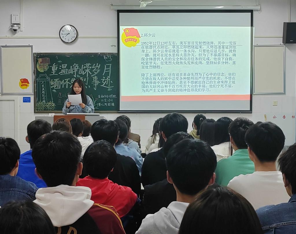 伴随着嘹亮的团歌声,各团支部组织的团课相继开展。在本次团课中,本次团课进行了革命先烈事迹学习,通过同学们激情的演讲让大家进一步感受往昔峥嵘岁月的红色血脉,以永不衰竭的激昂斗志,接起新时代的“接力棒”,走上新时代的“长征路”,做新时代的“答卷人”,同时团支部呼吁青年学子当不负前人之奋斗,接过时代火炬,以学习英雄的实际行动,告慰长眠地下的革命先烈。