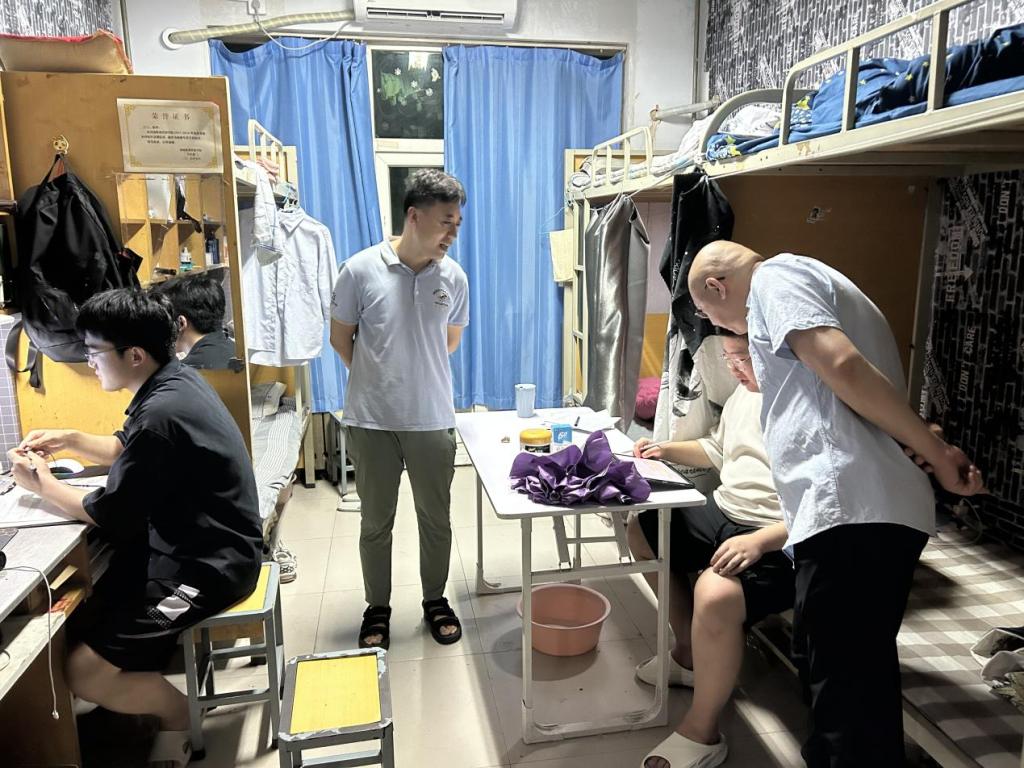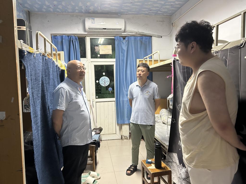 为关心暑期留校考研学子的学习与生活状况,坚定学子考研信念,缓解备考压力,7月27日晚,beat365平台唯一官网党委书记陈复昌、党委副书记汪晓伟、团委副书记刘慧莹前往英才校区8、9号楼宿舍,对暑期留校备战考研的学生们进行走访。