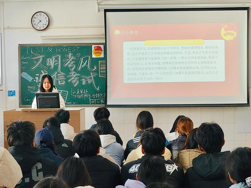 “人而无信,不知其可也。”各班级通过事例分享向同学们阐述了诚信的重要性和意义。紧接着,各团支书通过播放与考场诚信有关的视频,告诉同学们诚信不仅体现在道德规范等方面,还体现在遵守考场规则、诚信考试等细节上。最后,本次团课活动进入到了互动环节,各班组织同学们对诚信考试的要求以及对非诚信考试所带来的危害进行分享,并以此来引导同学们要认真备考,诚信考试。