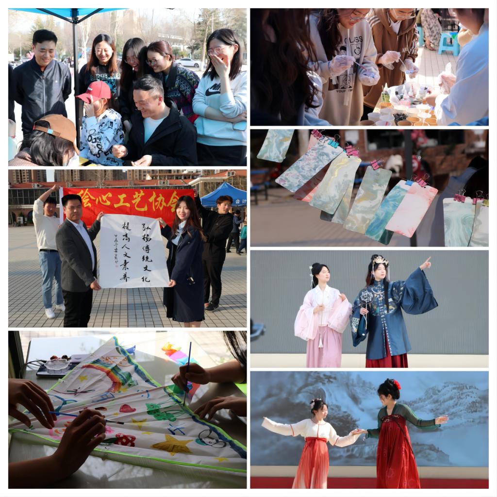 活动展开,扎染、漂漆、风筝制作、剪纸艺术、捏泥人、猜灯谜、武术表演、棋艺对弈、书画展示等传统文化项目交相辉映,似一幅幅流动的历史画卷被依次展至帐篷前,同学们翘首以盼,已然迫不及待。身着汉服的佳人匿于舞台之后,静待登台,欲献上惊鸿一面。