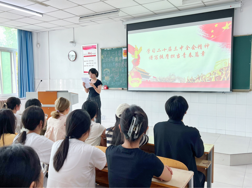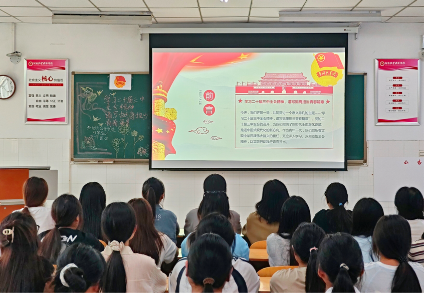 伴随着嘹亮的团歌声,各团支部的活动相继召开。首先,各班团支书通过向同学们播放党的二十届三中全会的部分片段,向同学们介绍党的二十届三中全会精神的内涵和意义,引导同学们了解挺膺担当的重要性。接着,各团支书组织同学们通过小组讨论,互相交流等方式,让同学们充分发表自己关于党的二十届三中全会精神的看法和感悟。最后,全班同学仔细阅读了党的二十届三中全会中习近平总书记对广大青年们的寄语,大大增强了同学们的担当意识和责任感。