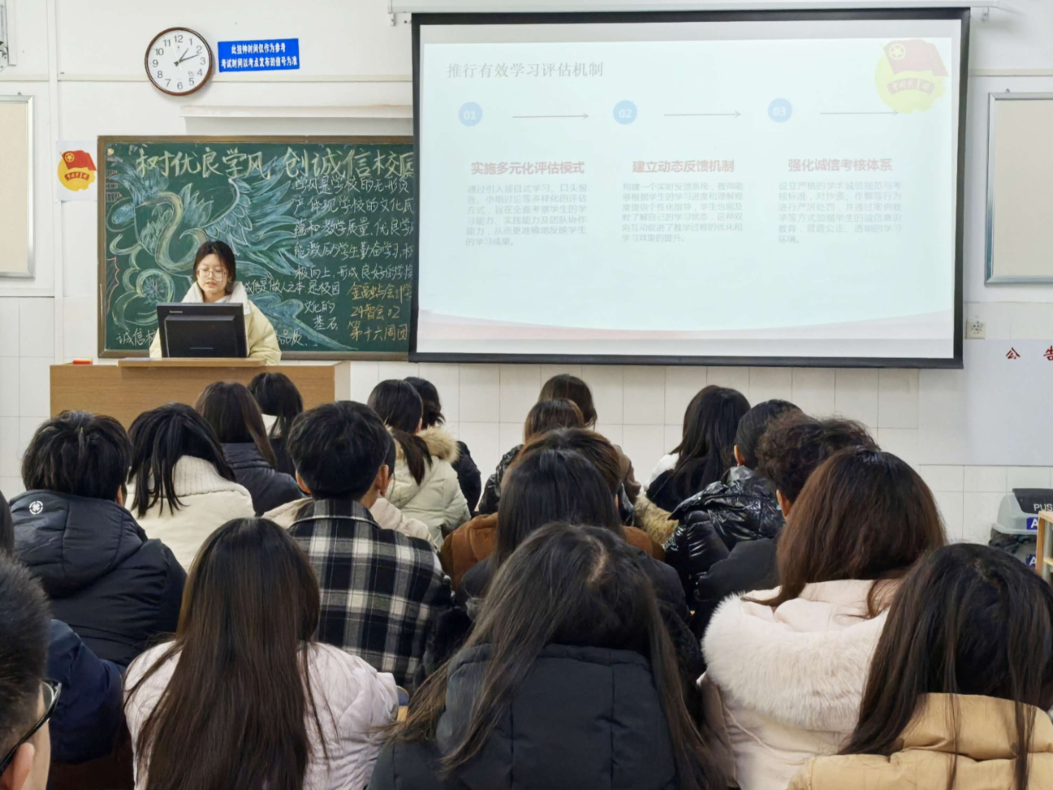 伴随着嘹亮的团歌声,本次团课正式拉开帷幕。首先,各班团支书向同学们介绍了创建诚信校园方面的内容,并带领同学们重新温习了《学生手册》上关于诚信考试的知识,让同学们意识到优良学风和诚信校园的建设是一项长期而重要的工作。此外,部分班级还分享了一些诚信案例,让同学们意识到树立诚信的重要性。最后,各班团支书号召同学们自觉遵守诚信原则,注重自身的学习和品德修养,相互监督、相互激励,形成良好的学习氛围和竞争环境,提升学校的整体形象。