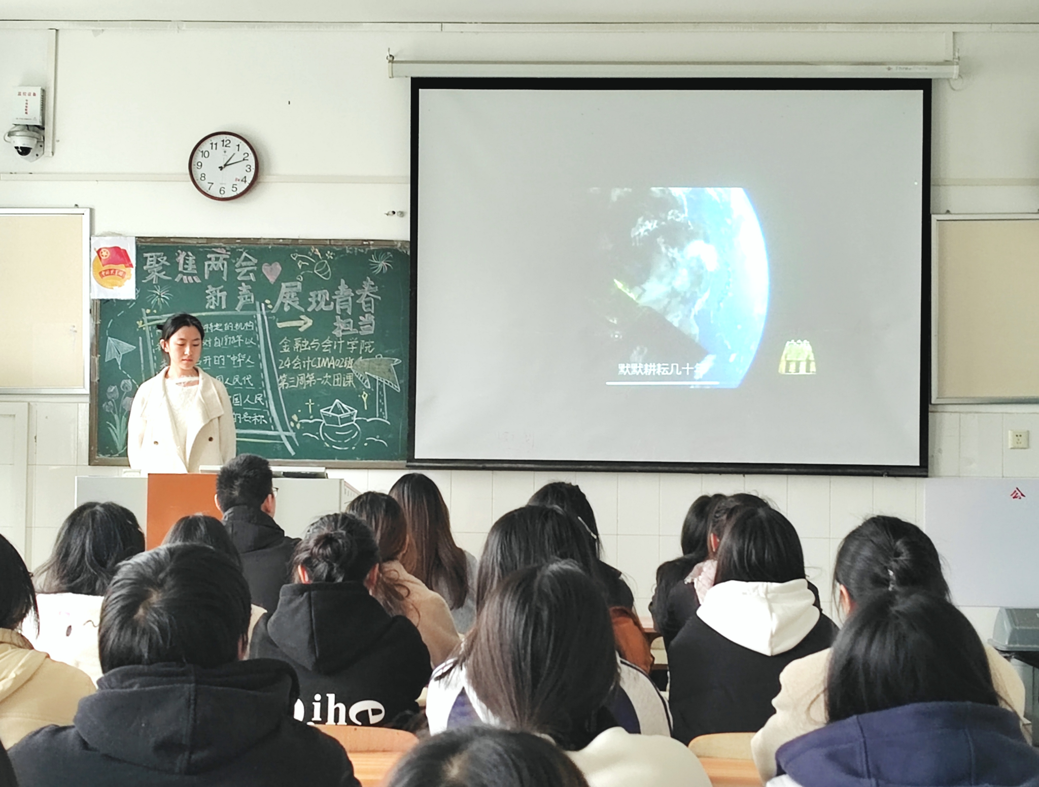 伴随着嘹亮的团歌声,团课正式开始。主讲人运用PPT与视频资料,对2025年全国两会的重要决议、方针政策进行详细解读,让同学们对国家发展方向有清晰认知。其次,通过组织小组讨论,团员们围绕两会热点议题与青年责任各抒己见,交流在教育、就业、环保等领域的看法,碰撞出思想火花。随后,由团委老师分享经验,结合自身经历阐述青年如何在时代浪潮中找准定位、发挥价值。