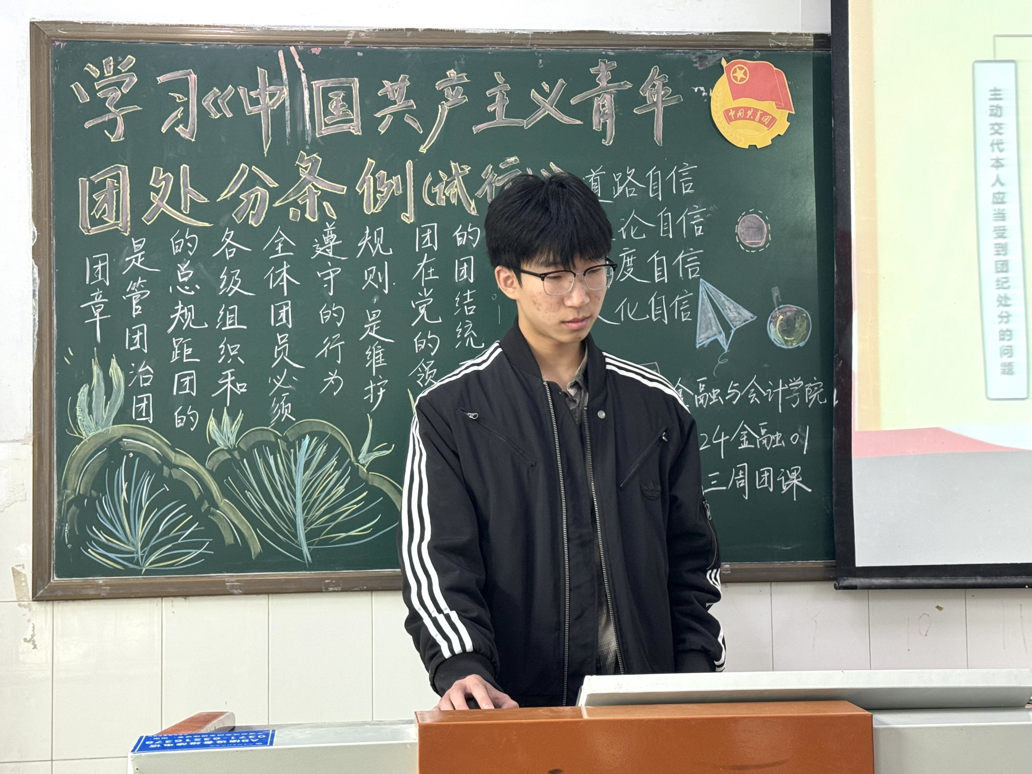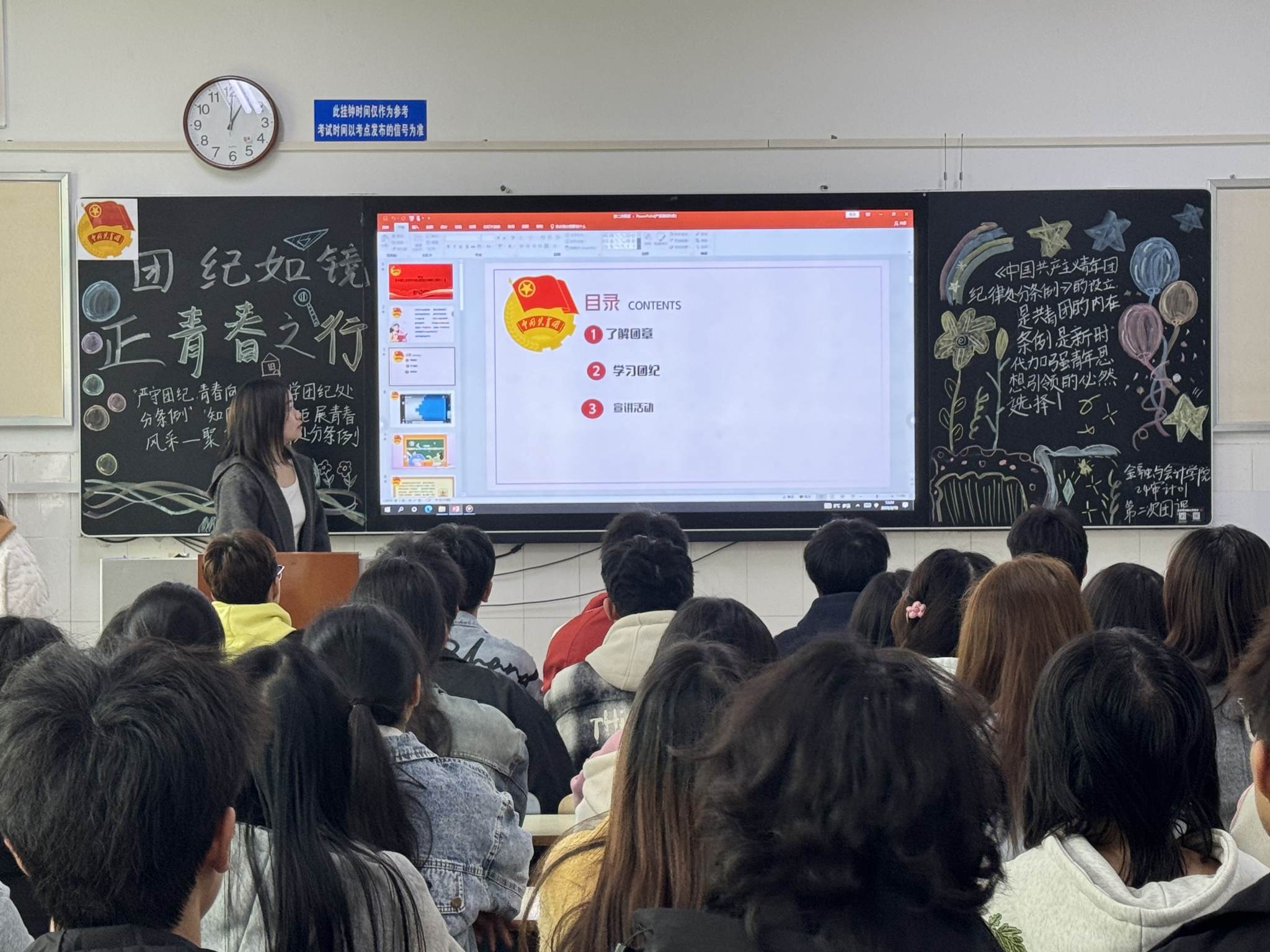 伴随着嘹亮的团歌声,团课正式开始。主讲人借助专题PPT,为团员们全面解读《中国共产主义青年团纪律处分条例(试行)》的出台背景、重要意义,阐述其对从严治团的关键作用,让大家明白纪律是共青团保持先进性与战斗力的基石。其次,主讲人结合具体案例,详细讲解条例中的各项规定,如团纪处分种类、对违法违纪行为的处分措施,加深团员对条文的理解。然后,组织团员分组讨论,结合自身在学习、生活、社会实践中的经历,探讨如何在日常行为中严守团纪,大家踊跃发言,分享看法。最后,团员代表上台总结发言,表达遵守团纪的坚定决心,并提出将通过定期开展小组学习、互相监督等方式,确保团纪深入人心。