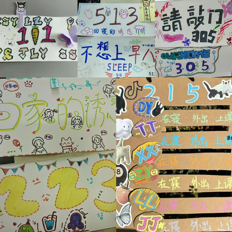 同学们以宿舍为单位积极参与,通过绘画、手工制作等多种形式设计独具个性的门牌。门牌内容不仅包含宿舍名称、成员姓名,还融入了各具特色的宿舍口号与专属元素,充分展现了同学们的创意与默契。活动现场,有的宿舍以卡通形象串联成员特点,还有的通过环保材料制作立体门牌,将“绿色校园”理念融入设计。 同学们分工协作,有的负责构图,有的裁剪装饰,有的撰写文案,在欢声笑语中共同完成作品。