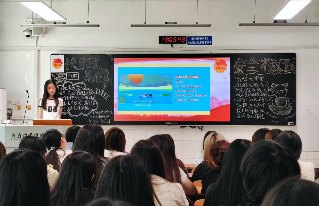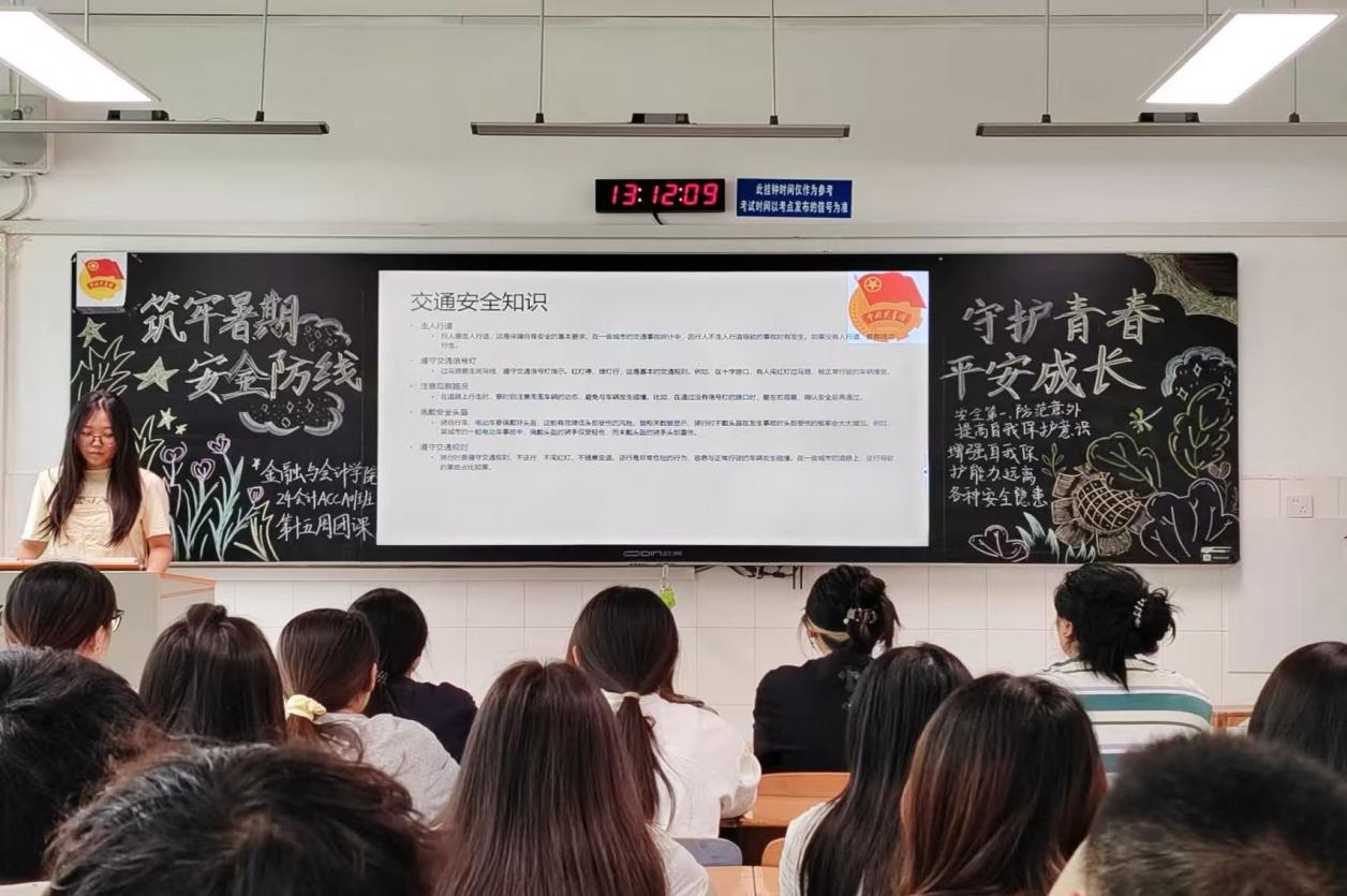 伴随着嘹亮的团歌声,团课活动正式开始。团课伊始,团支书通过播放安全事故教育片,以真实案例引发全体团员青年对假期安全问题的深刻反思。随后,在安全知识讲解环节,团支书通过图文并茂的PPT、生动详实的数据及深入浅出的讲解,依次对防溺水、交通、居家、网络等安全知识展开细致剖析。在防溺水板块,详细介绍了危险水域识别、自救与施救方法;交通安全部分,则结合常见违规行为强调规则重要性。理论讲解后,团课设置了互动交流环节,同学们积极分享生活中遇到的安全隐患及应对经验,在思想碰撞中加深对安全知识的理解。最后,通过安全知识提问与讨论,进一步巩固学习成果,确保每位参与者都能将安全知识转化为实际应对能力。
