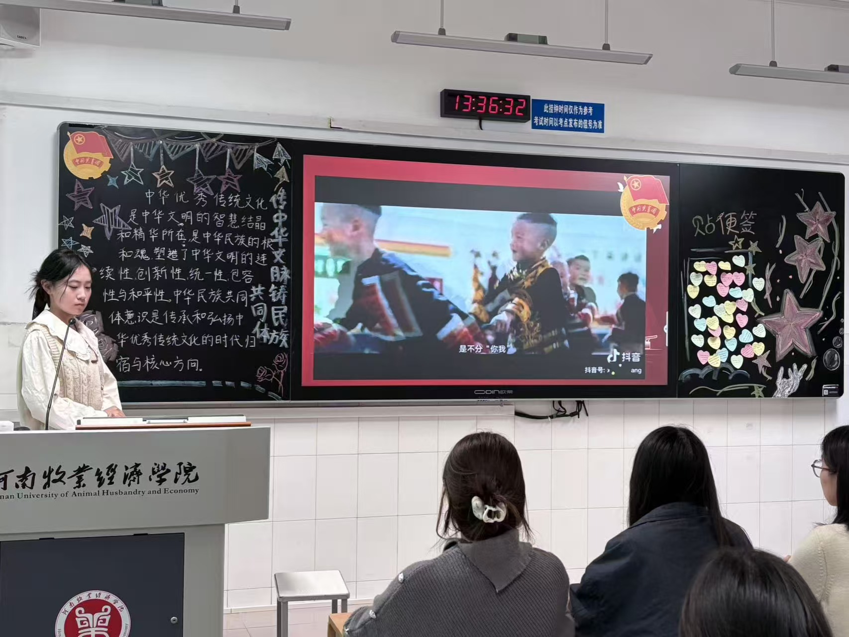 在嘹亮团歌声中,各班团课活动有序展开。活动伊始,各班团支书播放有关中华优秀传统文化的纪录片,引发了同学们对于文化认同以及民族认同的思考。接着,团支书带领同学们深入学习文化内涵,让同学们了解中华优秀传统文化作为中华民族共同体的精神根基,为各民族交往交流交融提供了共同的价值遵循,增强了大家对中华民族共同体的认同感、归属感和自豪感。过程中,各班还通过一些互动活动使同学们发表了自己的看法与见解,使文化传承与认同观念更具感染力。