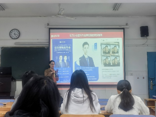 企业代表首先播放了该公司招聘宣传片介绍了公司现有规模,业务领域以及相关专业内容及福利待遇。广州经传多赢投资咨询公司深耕金融领域22年,是中国证监会核准的专业证券投资咨询机构、国内领先的金融信息服务商、互联网时代的金融科技先锋企业。该公司自主研发建立了一系列基于大数据、机器学习和自然语言处理等科技手段的金融另类数据产品,拥有国内顶尖的量化投资与交易团队。本次宣讲会由公司邓碧芯老师主讲,他向同学们详细介绍了公司的岗位设置,薪资福利,发展前景等信息,激发了同学们对于投资行业的深刻兴趣。
