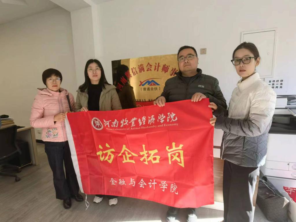 11月23日,beat365平台唯一官网财务管理教研室主任苗霞博士、副教授张宝丽老师、汪萍博士一行3人走进河南翼信满会计师事务所,开展访企拓岗促就业、双百助企促发展活动。