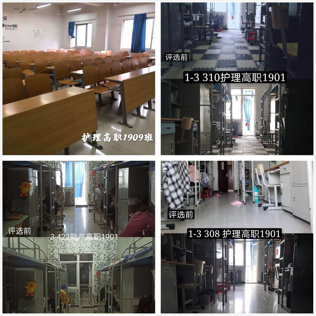 本次活动分为三个阶段。6月2日至7日,文明教室、文明宿舍初选活动正式开始。我院学生管理科科长李博强调了评选活动的时间节点及评选要求。要求辅导员、班主任积极动员学生参加活动,做好教室、宿舍卫生工作,建设温馨教室、宿舍环境,展现大学生文明礼仪。副科长苏建军带领辅导员和学生会成员对教室、宿舍卫生进行了检查和评比,对教室、宿舍的安全隐患进行了排查,杜绝了不安全事故的发生。6月8日至21日,学生会对初选中表现较好的班级进行再次检查,分别从教室、宿舍文明风貌、学生自身素质、学习态度、班级的文明纪律、学习态度、宿舍风气等方面进行了评比。经过为期一月的评比,6月22日至7月1日,活动最终选出2号318宿舍、 2号322宿舍等21个宿舍获得文明宿舍荣誉称号;护理高职1902班、1906班等6个班荣获文明教室荣誉称号。