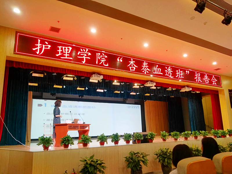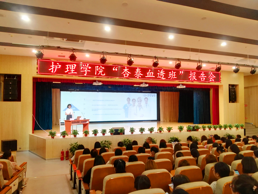 杏泰公司护理总监蒋婵婵老师作了题为《我们是透析卫士》的报告,为大家阐述了血液透析的发展史、血液透析护理人员的工作现状,并根据全球透析人数上升幅度展望了我国血液透析行业的前景。两位老师共同认为一名合格的血液透析护士对患者所具有的同情心,责任心和关爱是不可或缺的,娴熟精湛的操作技术是护理人员战胜疾病的保障。张文信对同学们提出了殷切的期望,希望在新的起点上,同学们能抓住机遇,迎着朝阳,向着胜利,义无反顾的奋斗前进。