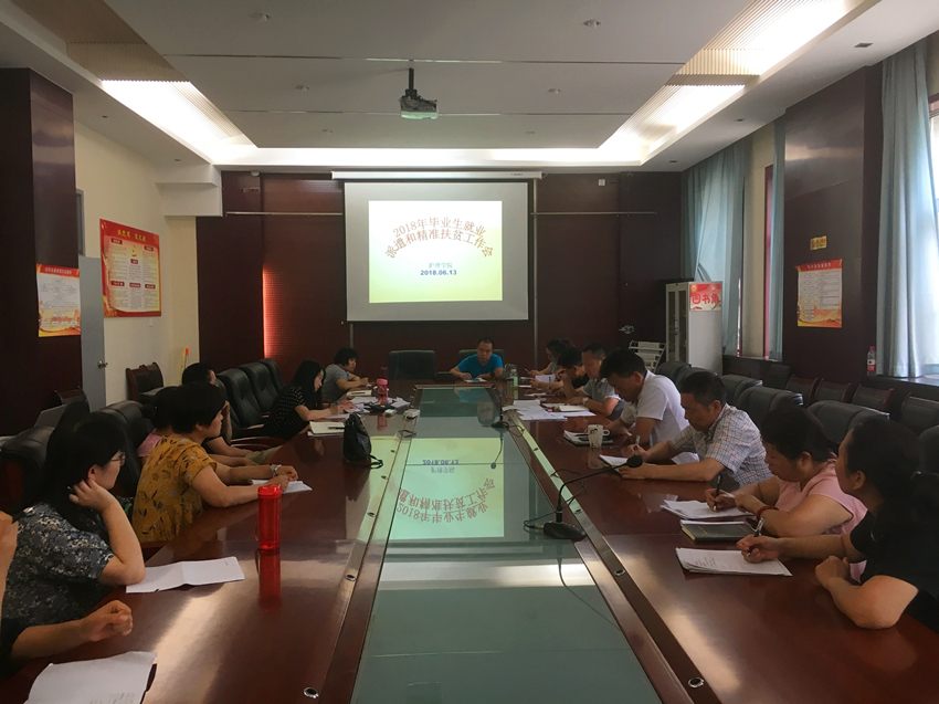 6月13日下午,澳门网投唯一官网在医训楼第一会议室召开2018届毕业生就业派遣和精准扶贫工作会议,党总支书记吴运胜、副书记张春兴、学生科科长李博、副科长苏建军、就业办罗彦庆老师及2018届毕业班辅导员、班主任参加了会议。