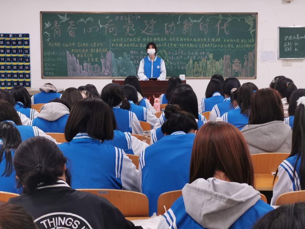 本次团课由各班团支书主讲。团支书从“青春”意味着什么,“新时代的我们是否有明确的理想信念”两个方面讲述了青春的真谛。他们通过对我国现阶段的瞩目成就和目前的国际形势的介绍,倡议同学们向2020年涌现的优秀医护工作者学习,立足医护事业,努力学习护理技能,坚守护理职业道德,服务祖国医护事业。学生胡豪认为:“作为青年一代的我们,应该珍惜负重前行下的岁月静好,扣好人生第一粒扣子,勤学、修德、明辨、笃实。”学生郑宇新认为:“作为一名入党积极分子,我们要坚定党的理想信念,要有足够的勇气和决心迎接挑战,承担责任,要勇立潮头,敢为人先,以实际行动践行不忘初心跟党走,青春建功新时代。”