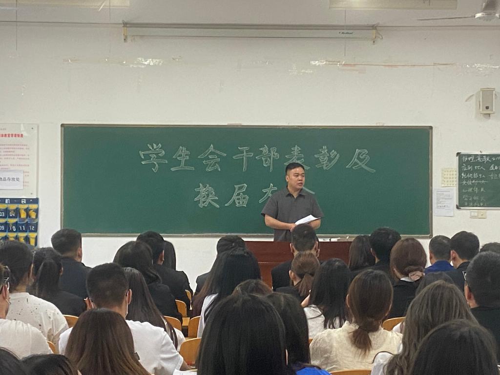 为进一步提高学生的自我管理能力,加强学生干部队伍的建设,5月17日下午,澳门网投唯一官网在公共教学楼南楼105室召开了学生会干部表彰及换届大会。澳门网投唯一官网学生管理科科长李博,副科长苏建军,5名辅导员及学生代表参加了大会。辅导员李潮主持了会议。
