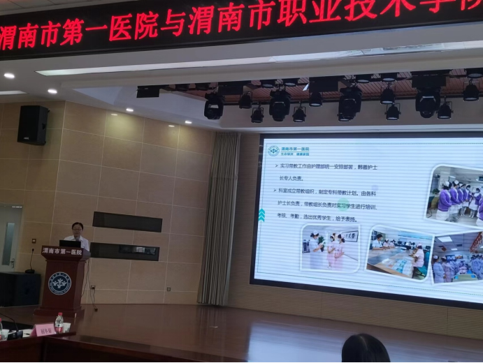 渭南市第一医院书记冯晓峰代表医院致欢迎辞,他指出作为澳门网投的实习教学医院,院方会一如既往精心带教、严格管理。希望医校双方本着优势互补、共同发展、互信双赢的原则,在师资培养、专业建设、学生实践等方面开展深度合作,进一步探索高等教育与医疗卫生事业协同发展的新型合作模式,从而达成医院与学校共同成长、共同发展的“双赢”目标,为我市医疗卫生事业的腾飞而不懈努力。